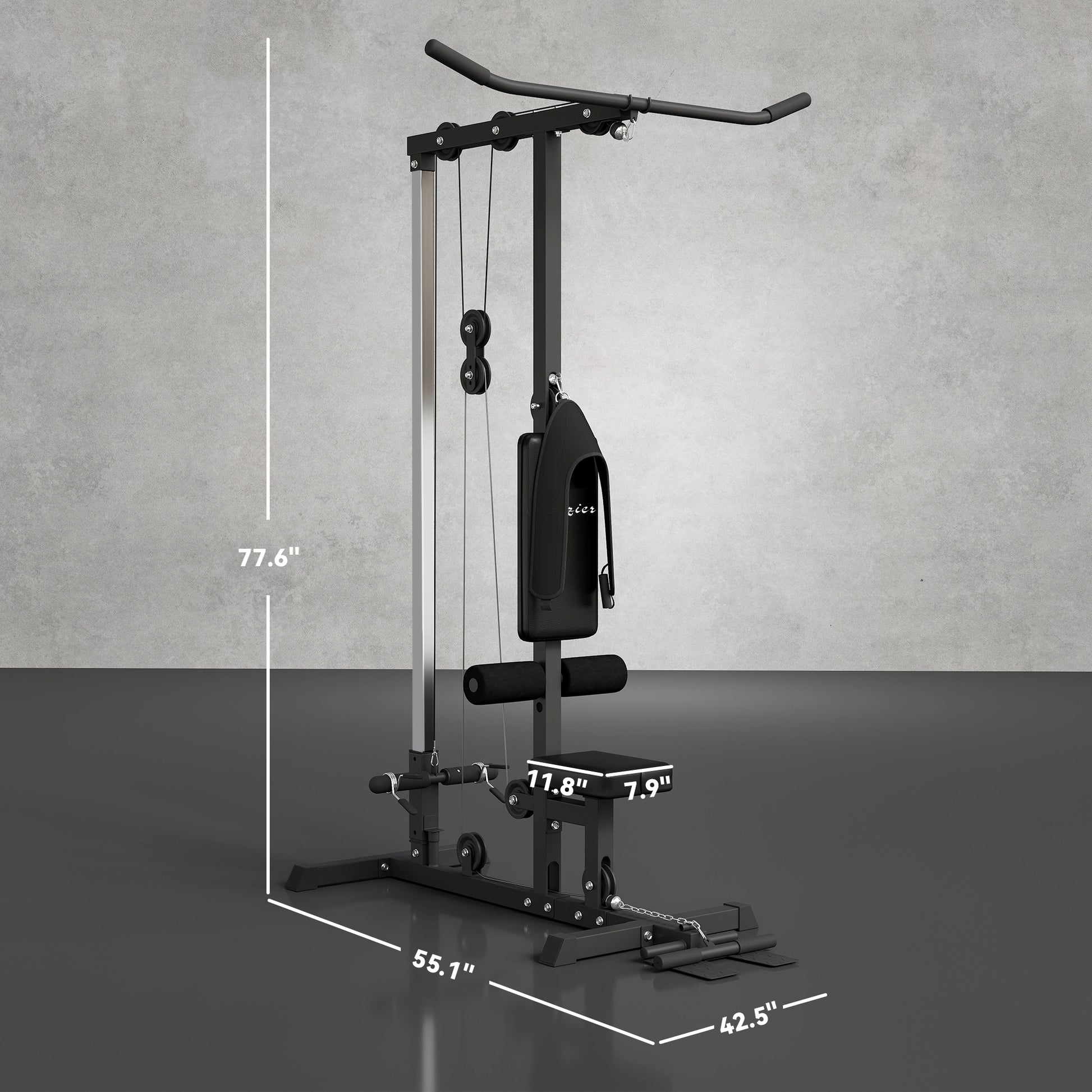 If you want to workout like a pro at home, it's time to look at the Soozier home gym system. Our lat pulldown machine includes an added low-row pulley, allowing a range of exercises for your shoulders, back, and chest. An ergonomic handle, adjustable height, and angle allow you to lift safely and comfortably. A tough steel frame and adjustable weight plates let you progress your way to 110 lbs. When you bring the gym home, you exercise on your schedule and your rate. Score big with Soozier. Features: - Lat pull down and low row pulley station - Comes with adaptors, compatible with both 1" and 2" opening weight plates - Non-slip 90° flip-up wide pedal - Padded seat adjustable to four different heights - Made with strong steel to provide a machine that won't quit - Assembly required Specification: - Color: Black - Materials: Steel, PU - Materials: Steel, PU - Overall Dimensions: 55" L x 42.5" W x 77.5" H - Pull-down Bar Size: 1" Dia x 42.5"L - Low-row Bar Size: 1" Dia x 15"L - Seat Size: 11.75" L x 7.75" W x 16.5" - 20" H - Back Size: 19.75" L x 9.75" W - Foot Pedal Size: 11.75" L x 7.75" W - Max Counterweight: 55 lbs. for a side, 110 lbs. in total - Weight Capacity: 242 lbs. - Item Label: A91-293V00BK Package Includes: - 1 x Workout Equipment - 1 x Manual If you want to workout like a pro at home, it's time to look at the Soozier home gym system. Features: - Lat pull down and low row pulley station - Comes with adaptors, compatible with both 1" and 2" opening weight plates - Non-slip 90° flip-up wide pedal - Padded seat adjustable to four different heights - Made with strong steel to provide a machine that won't quit - Assembly required Specification: - Color: Black and Red Materials: Steel, PU - Materials: Steel, PU - Overall Dimensions: 55" L x 42.5" W x 77.5" H - Pull-down Bar Size: 1" Dia x 42.5"L - Low-row Bar Size: 1" Dia x 15"L - Seat Size: 11.75" L x 7.75" W x 16.5" - 20" H - Back Size: 19.75" L x 9.75" W - Foot Pedal Size: 11.75" L x 7.75" W - Max Counterweight: 55 lbs. - Item Label: A91-293V00RD Package Includes: - 1 x Workout Equipment - 1 x Manual.