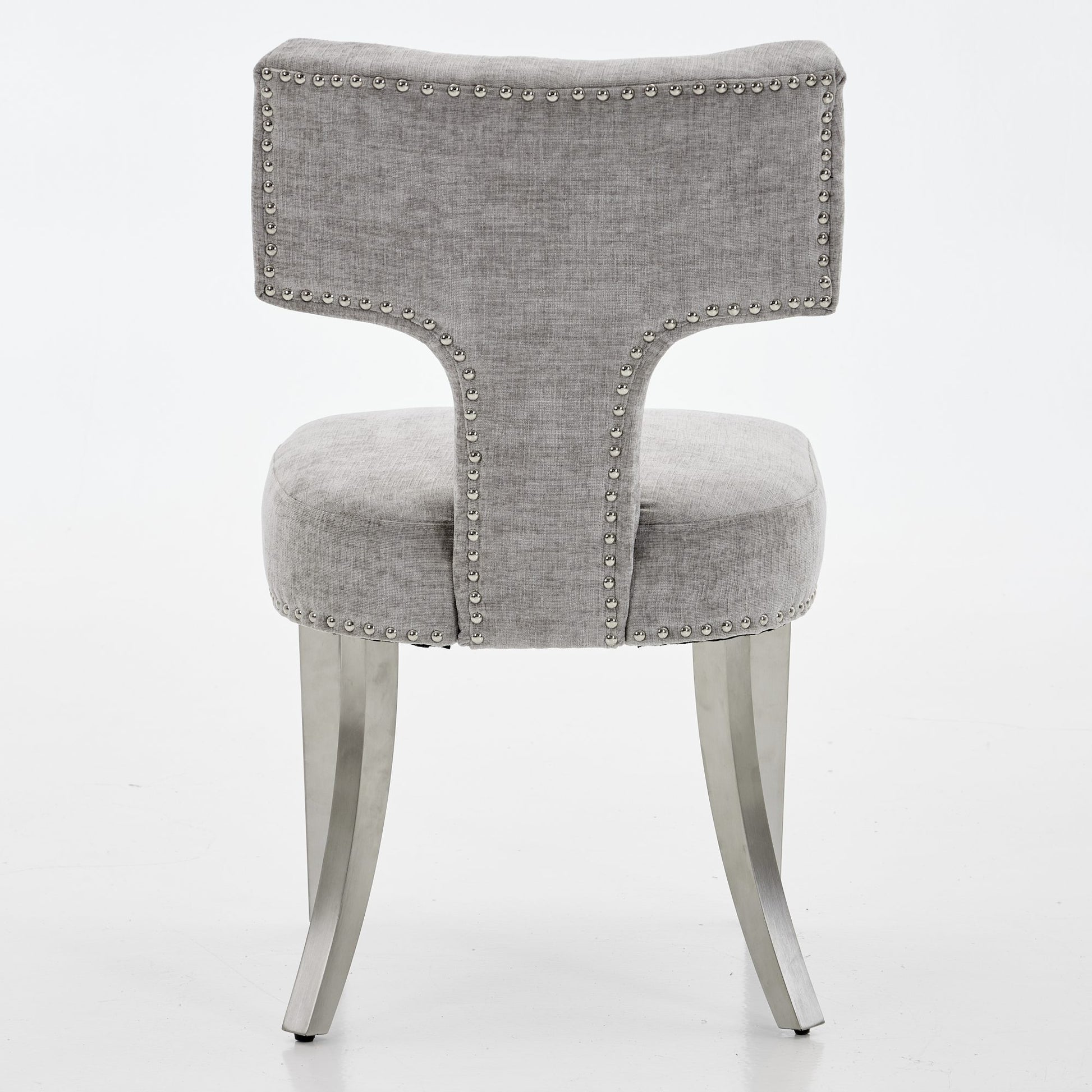 Product Name:Mid Century Modern Dining Chairs Set of 2, Farmhouse Chenille Fabric Upholstered Accent Chair Curved Backrest with Copper Nails around,Kitchen Chairs with Silver Brushed Stainless Steel Legs, Gray